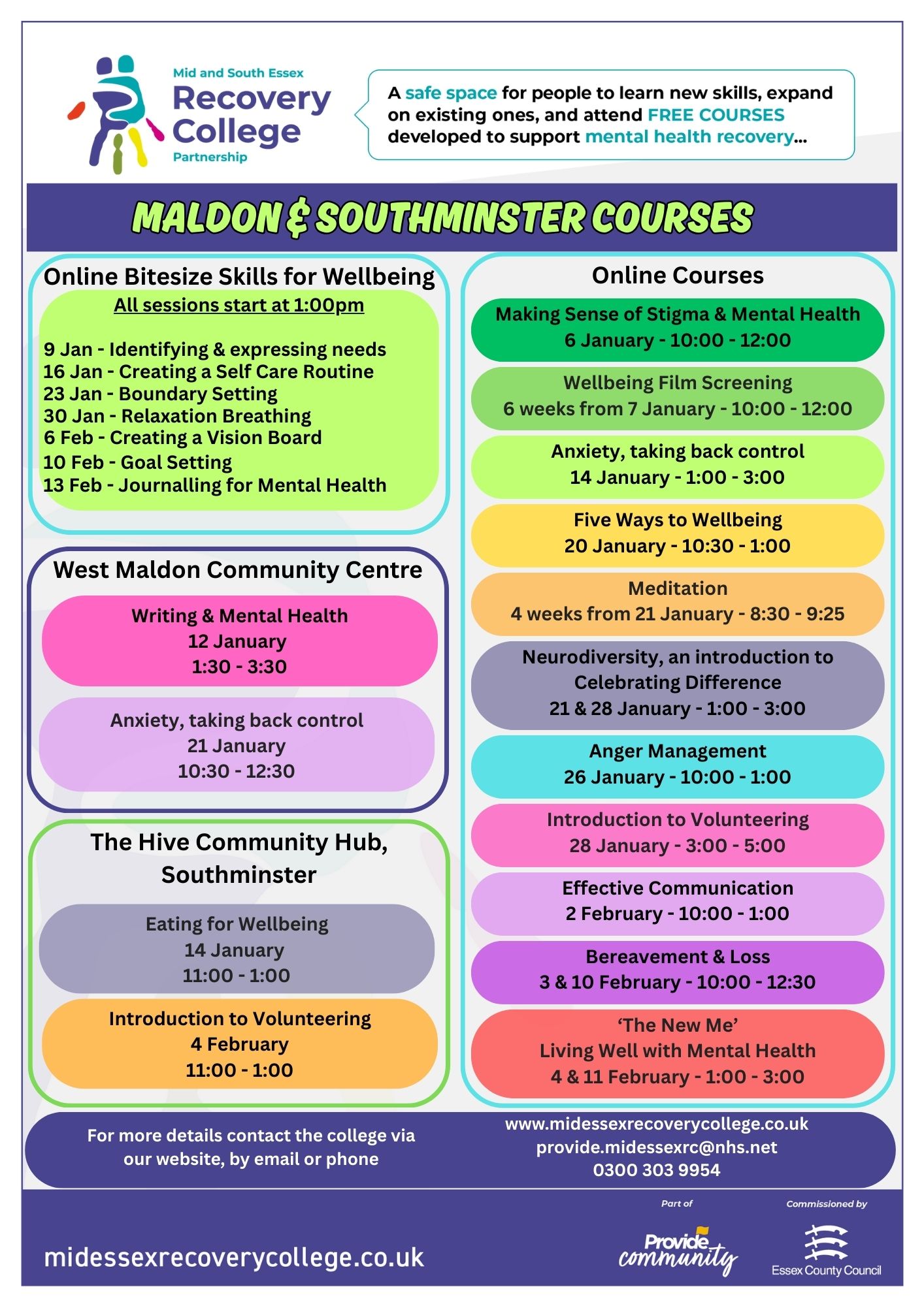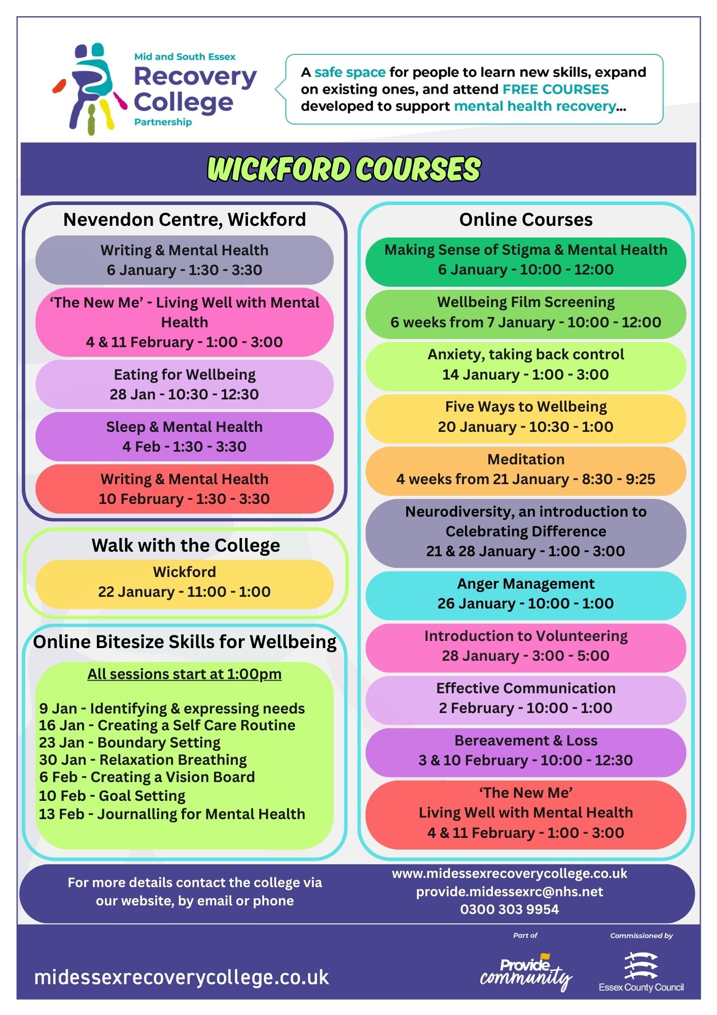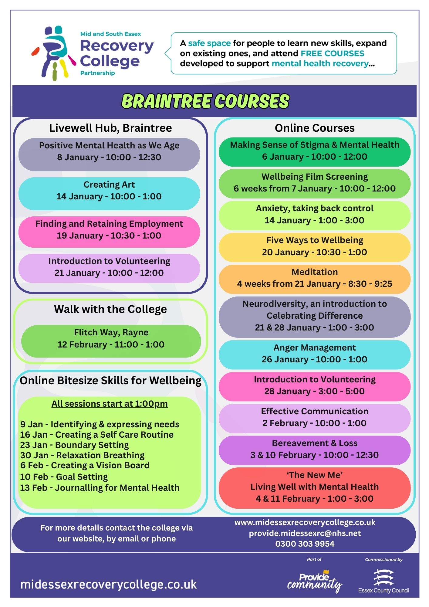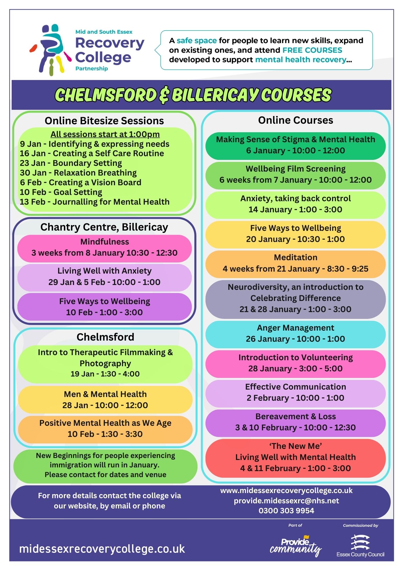 Mid and South Essex Recovery College is pleased to share its latest programme of free mental health and wellbeing courses running across Mid and South Essex throughout January and February.
